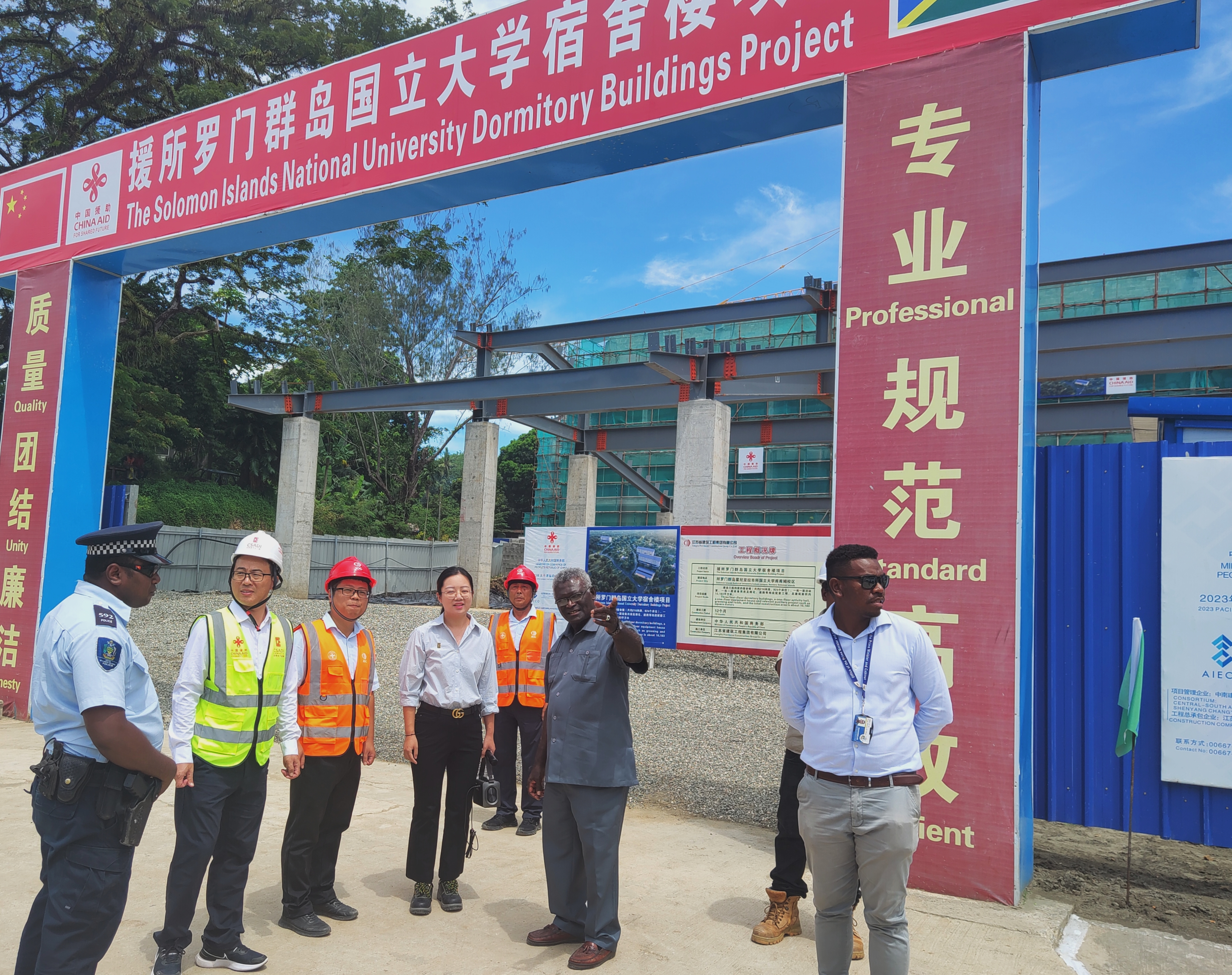3月22日,所羅門群島總理索加瓦雷在中國駐所羅門群島大使李明陪同下,參視察了由集團承建的中國政府援所國立大學宿舍樓項目施工現(xiàn)場。所政府多位內(nèi)閣部長、議員、太平洋運動會組委會成員陪同。