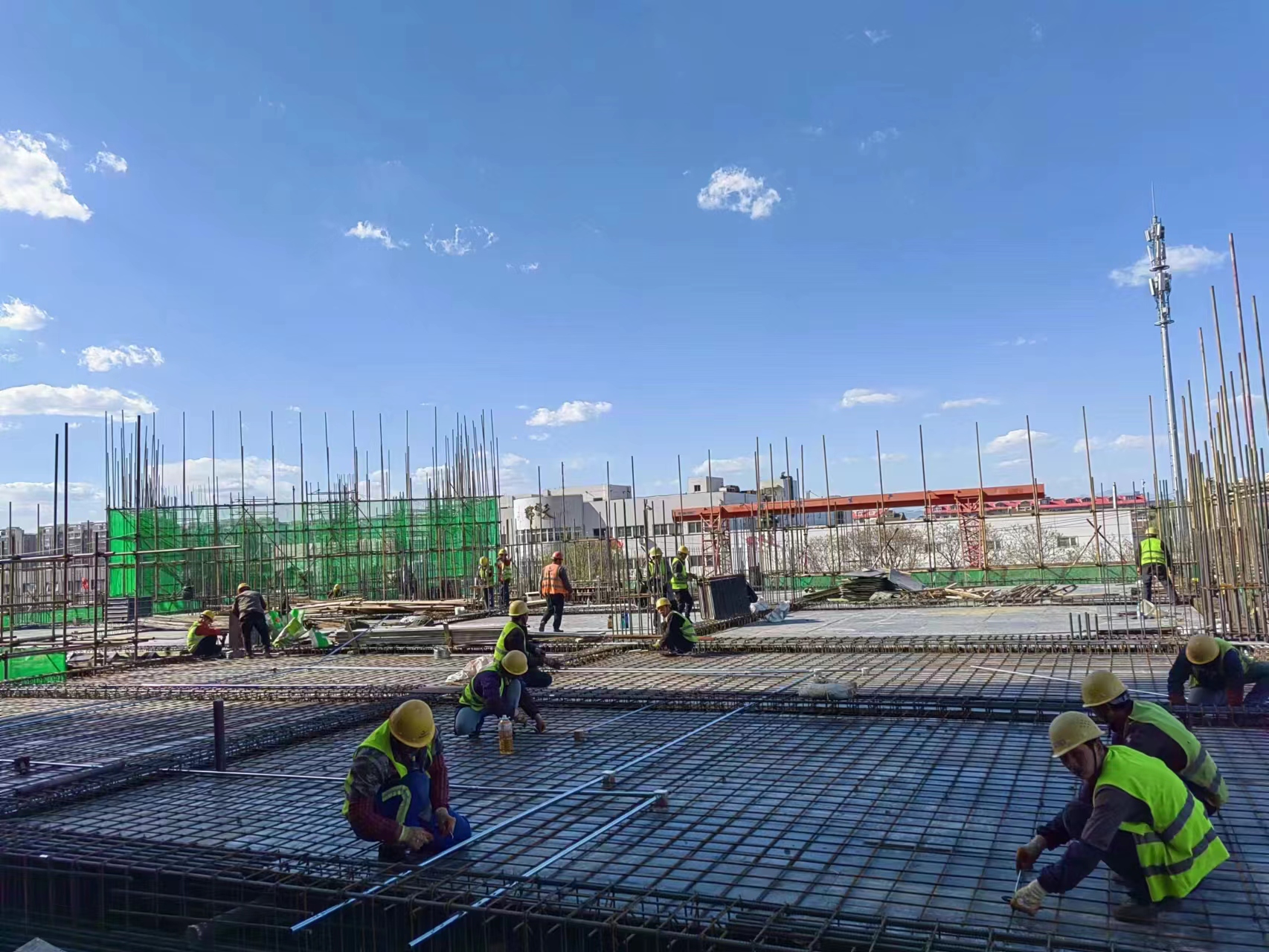 在第二工程公司蘇州蠡口智慧家居社區(qū)(一期)項(xiàng)目建設(shè)現(xiàn)場(chǎng),同樣熱火朝天,建設(shè)者堅(jiān)守施工一線進(jìn)行主體塔樓A一層鋼筋鋪設(shè),主體塔樓B二層模板鋪設(shè),大家變“假期”為“工期”,奮力跑出項(xiàng)目建設(shè)“加速度”。